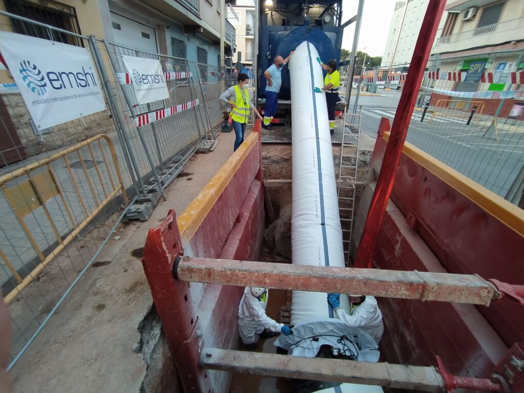 Respecto a la segunda obra que se concluye también hoy, se trata del proyecto en el casco urbano de Manises para el que se optó la utilización de la técnica de la manga para renovar una tubería, ya que este método minimiza al máximo el impacto de los trabajos al no abrir zanjas. La conducción que requería rehabilitación discurre por la calle Ferrandis Luna, una zona altamente poblada de esta localidad. Precisamente por ello, para ocasionar las menores molestias posibles en el entorno urbano y a la población, el equipo técnico de la EMSHI decidió emplear esta técnica con el fin de abrir únicamente las catas necesarias para introducir la manga desde un extremo a otro y en los cambios de dirección, pero no durante todo el trazado que, en este caso, era de 300 metros.