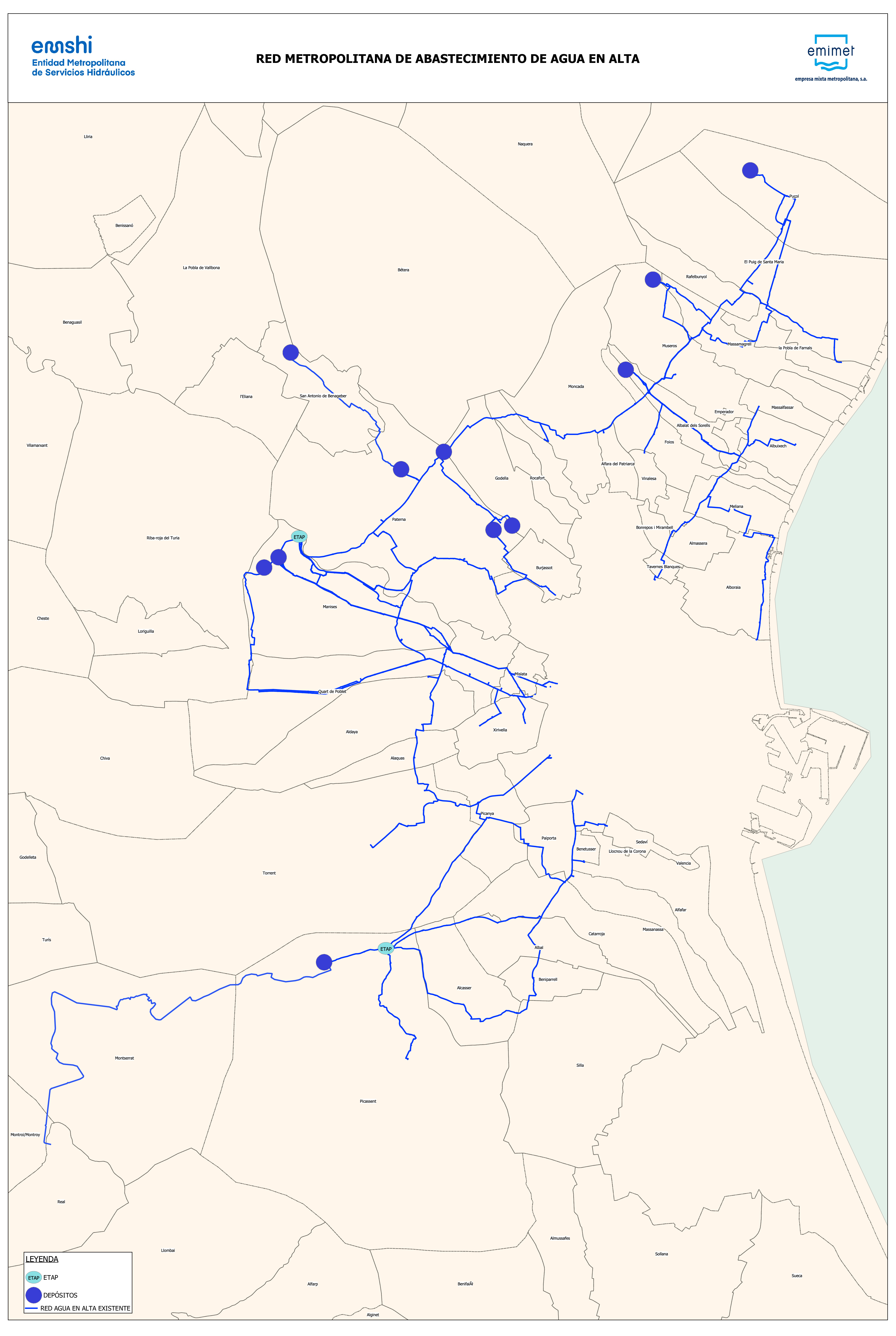 Más de 210 kilómetros de tuberías de diámetros de 200 a 1600 mm conforman el Sistema Básico Metropolitano de distribución. Mediante dichas conducciones se transporta el agua desde ETAPS a los municipios miembros de la EMSHI, contando cada municipio con uno o varios puntos de entrega a partir de los cuales cada Ayuntamiento realiza la distribución mediante su red de abastecimiento en baja.